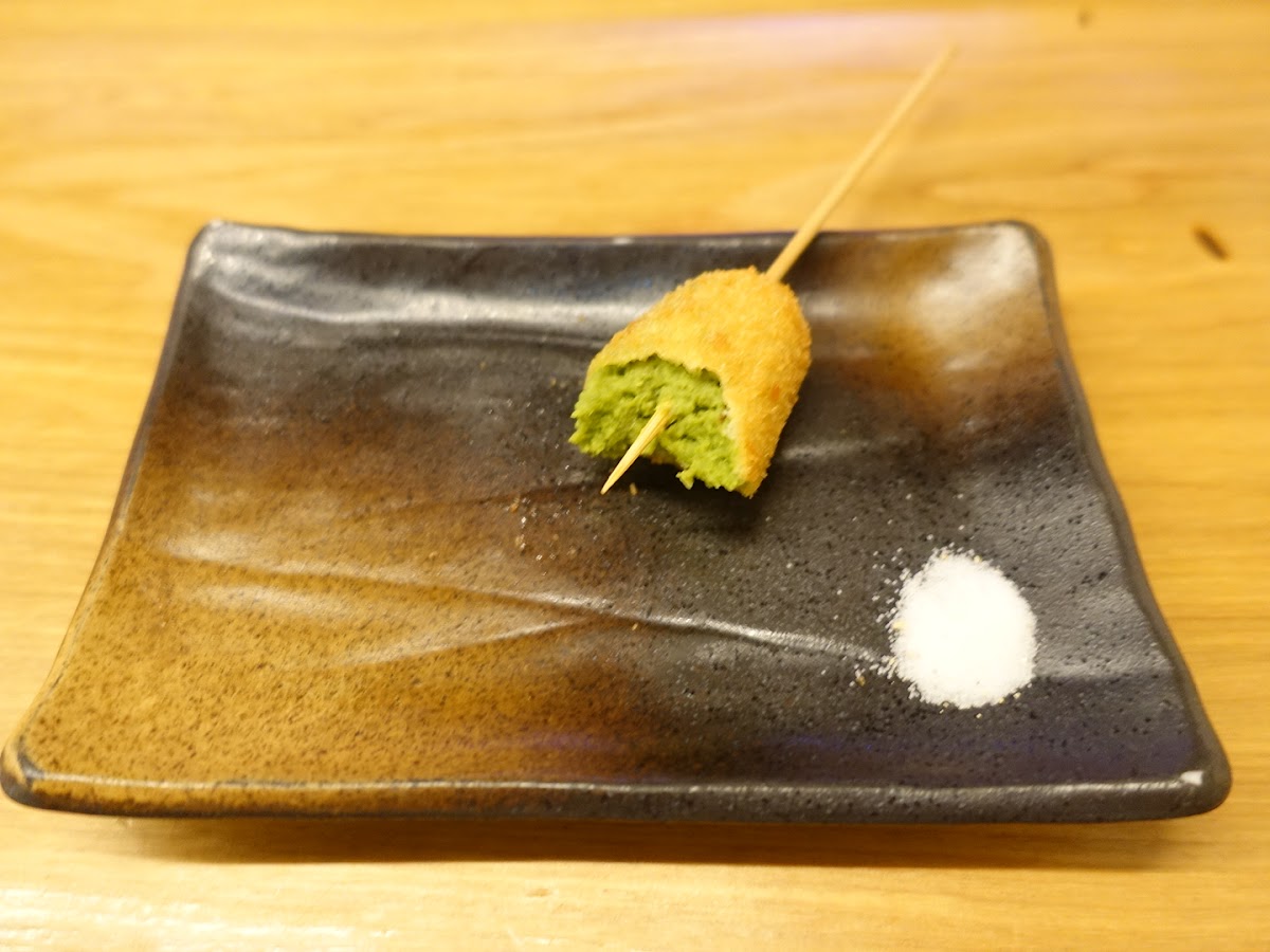 The restaurant is known for its expertly grilled skewers, including some must-try highlights like the Deep-Fried Green Peas Croquette on Skewer, a crispy, savory bite that perfectly balances texture and flavor. Another standout is the 博多焼とり重, a delightful dish that showcases the rich flavors of Fukuoka's unique style of yakitori, bringing together tender, flavorful chicken on a bed of perfectly steamed rice. For those who enjoy a savory mix of tastes, the ぼんじり, or chicken tail, is a must-have, offering a deliciously fatty and juicy bite. The 親子丼, a comforting chicken and egg rice bowl, captures the essence of Japanese home-cooked meals, combining tender chicken with fluffy eggs and a touch of soy-based seasoning. Lastly, don’t miss the つくね 軟骨, chicken meatballs with cartilage, a perfect mix of juicy, flavorful meat and satisfying crunch.